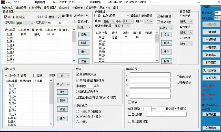 独家功能:全自动一键倒米功能,全自动高昌捡图功能,帮会联赛功能,自动更换指定技能功能,分批升级生活技能功能,自动上架紫装功能,红装功能,自定义上架紫冰红冰数量,一键打开易市,一键打开包裹,一键打开商城,配置表方案选择,银两颜色识别模拟器自动起号,上号功能(无技术者不推荐使用)其他辅助没有的我们都有,其他辅助有的功能我们也有,目前King辅助可以做到几乎0人工,升级速度快。使用倩女幽魂手游King辅助让你升级快人一步,遥遥领先!